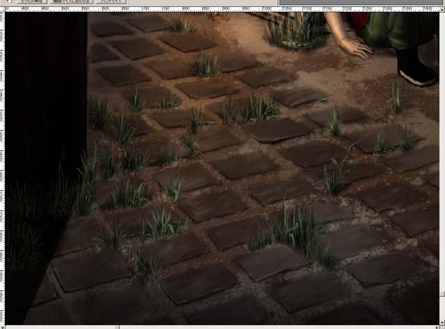 右の雑草は密度が濃いので点々で描いていく。なんとなく沢山生えてるように見えればよし・・・!;